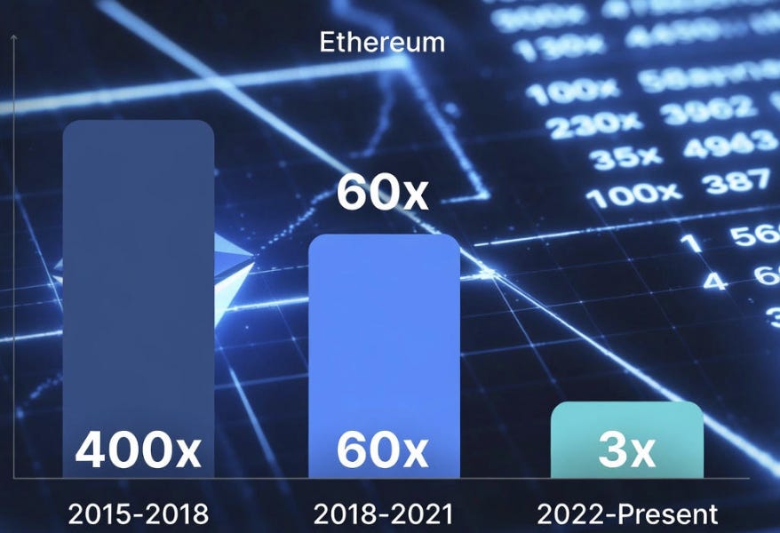 Ethereum’s returns display a similar trajectory of declining cycle multiples: